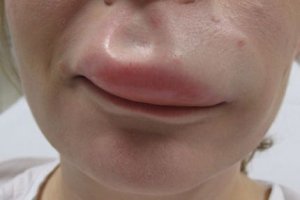 Лицо пациента становится одутловатым, наиболее выраженная отечность наблюдается в области носогубного треугольника, нижних век, щек и верхней части шеи.