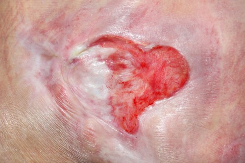 - Гнойное расплавление. Открытые раны становятся воротами для вторичной инфекции. Ухудшение состояния пациента связано с нарушением трофики тканей. Процесс прогрессирует быстро, затрагивая все более глубокие слои. Распространение поражения на подкожную клетчатку, мышцы, фасции и надкостницу протекает тяжело и негативно сказывается на общем состоянии здоровья пациента.