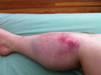 Средняя форма. Гематома формируется через 3-5 часов после травмы. Наблюдаются отечность, болезненные ощущения и иногда ограничение подвижности пострадавшей конечности. Необходима консультация врача для определения дальнейших шагов в лечении.